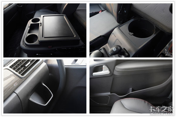 再回过来看储物空间,过去很多驾驶员经常会遇到驾驶室里面没有放置手机位置的尴尬情况。显然,这种情况不会出现在解放JK6之上,除了在中控区设计有很多小型的储物格之外,中部档杆位置也设计有不同规格的储物槽与杯架,并且副驾驶的座椅也可以翻折过来,形成很多的小型储物空间。
