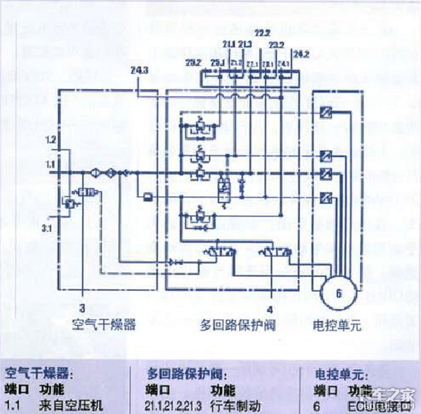 另外电控APU最主要的功能就是合理调配不同部位的气流来分配使用,比如你的储气罐漏气了,但是空气悬架气囊里面还有气。这个时候你要启动车辆,电控APU就会自动把气囊里面的气通过气路到制动分泵上,包括驾驶室座椅、悬架的气都会第一时间供给制动用气,确保行车制动可以正常使用。