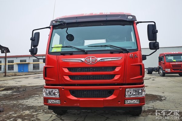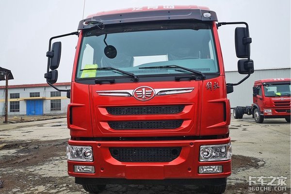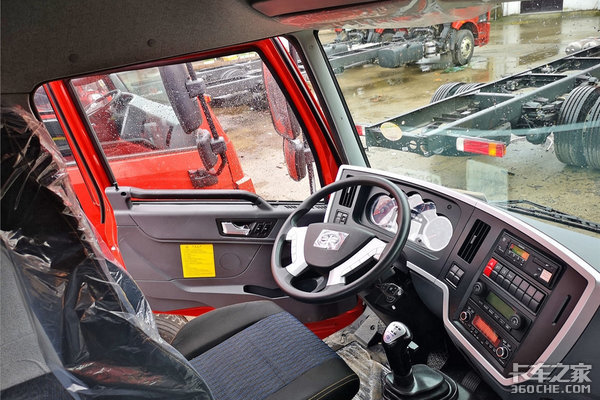 解放龙V这款车是装配的龙V半高顶半浮驾驶室,内部垂直空间较好。整车为大红色涂装,外观造型延续解放家族式设计。另外,该车的导流罩为选配,有需求的卡友可以选择安装。