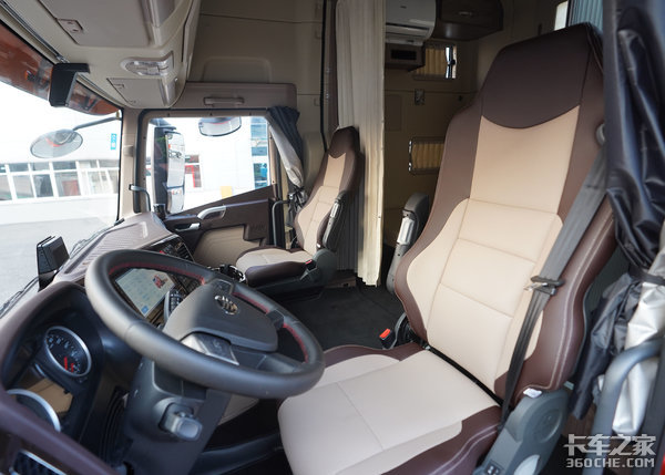 车内为平地板,驾驶室采用全新开发的六点气囊悬浮,在驾驶室中间多加了两个气囊悬架,减震效果和舒适性相比四点气囊悬浮更加出色,这也是国内首例采用六气囊悬架的重卡产品。