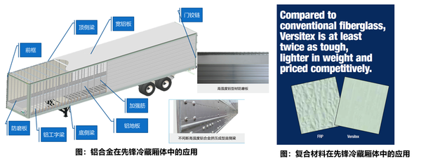 挂车先锋5号冷藏车大量应用铝合金及复合材料等轻量化材料。例如外蒙皮和顶板采用更环保、更轻、更耐腐蚀的铝合金板,底侧梁、顶侧梁、前框、防磨板、底板采用6系高强度铝合金型材作为拓扑框架,内衬板采用VR热塑性复合高分子食品环保级材料,重量更轻、强度更好,且有效阻燃阻热,避免原金属内衬板经常发生的冷凝现象造成货损。