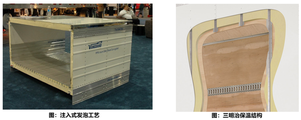 冷藏车厢的顶板、侧板、门板采用三明治结构,环保保温材料通过注入式PU发泡工艺注入内外蒙皮中间形成均匀的保温层,金属导体通过保温材料隔绝热桥传热,且阻燃,发泡剂采用进口245fa和环戊烷保证稳定的保温性能。顶部可定制“I型”或“倒Y型”风道,加之底部高强度堡型地板,可以更加冷气可以更加均匀的到达车厢每一个部位,厢内最低温度能达到零下28摄氏度。