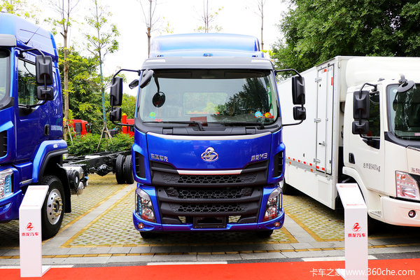 组合式大灯集成了远近光灯、日行灯和转向灯,雾灯布置在下方。侧面的蓝色点缀,继承了乘龙的家族式设计语言。采用三段式保险杠,哪段坏了修哪款,大大降低了日常维修成本。
