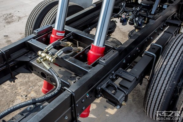 福田小金刚采用中置双油顶设计,这种设计更偏向于轻量化公路自卸车,具有重心低、稳定性强、自重轻等优势。