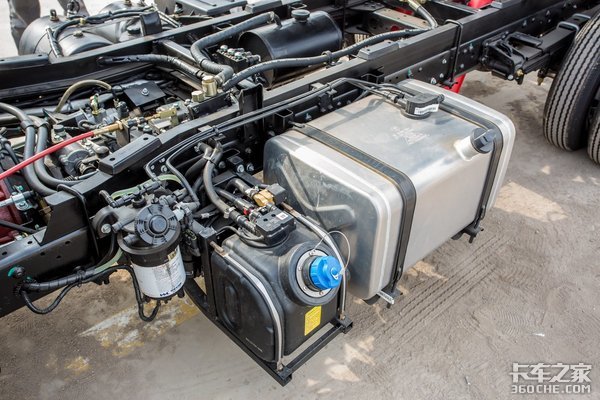 小金刚车架左侧设有柴油滤芯、尿素罐、铝合金油箱,布局很紧凑。除了配备铝合金油箱之外,福田小金刚在车身、底盘、货厢等部位采用高强度钢材及轻量化模块化设计,以达到降低自重目的、符合蓝牌标准。