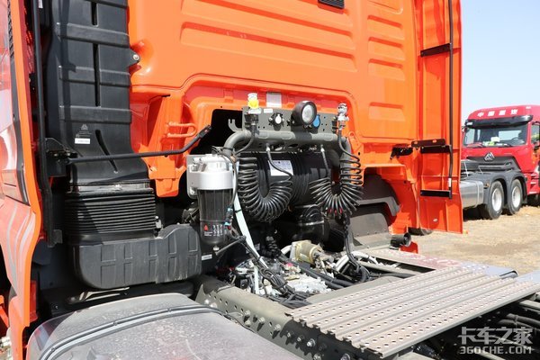在车身布局上,实拍车型依旧集成了汕德卡的紧凑工艺,车身左侧安装了后处理系统、尿素罐和蓄电池等车身附件。