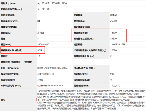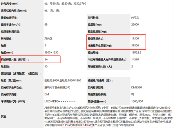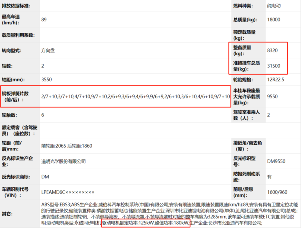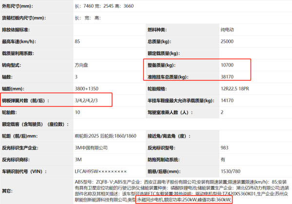 说起重卡行业的搅局者,三一算是其中一个,在这一批次的公告上,三一也公示了自己的纯电动6x4牵引车。整车自重为10.7吨,准牵引车质量38.17吨,用的是普通钢板悬架。采用的是电池是湖北亿纬动力提供的磷酸铁锂电池,至于多少度没有公式。