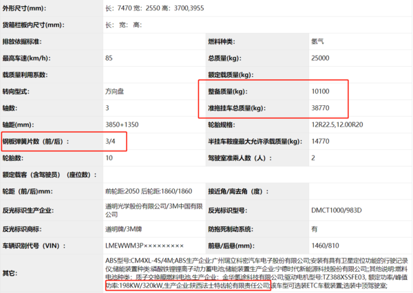 驱动电机用的是特百佳动力科技有限公司的永磁同步电机,峰值功率是355kW(483马力),采用钢板悬架。从照片上来看,储氢设备应该是放在了驾驶室后部,动力电池则是放在了车架两侧。