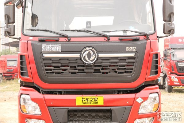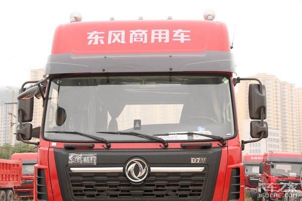 实拍车辆是东风畅行D7V LNG 6×4牵引车,整车使用的是东风家族式外观,前脸顶部有“东风商用车”品牌字样,车辆辨识度比较高。还装有气喇叭,声音的震动强度以及传播范围比较广,警示效果较好。