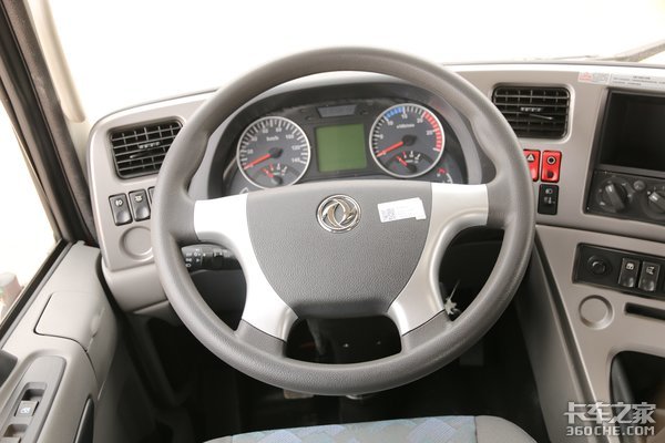 仪表盘为组合式,左边是时速表,右边是发动机转速表,中间的显示屏可以显示剩余气量等信息,方向盘是普通的四辐式设计,并且由皮质材料进行包裹,手握感比较好,方向盘中间是东风的“双飞燕”品牌logo,起到了很好的装饰作用。