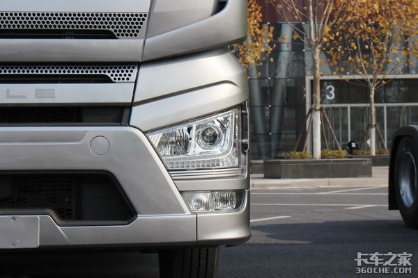 这款J7依旧是采用家族式设计,前脸看起来非常的高,整车采用银灰色的喷涂,非常高级。倒梯形的进气格栅采用蜂窝状设计,最上层的进气格栅贯穿解放的飞鹰车标。立体的前脸设计看起来非常的威武,实拍车在驾驶室顶部以及中网两侧装配有导流罩以及导风槽,不仅让车辆看起来更加美观,还可以有效降低行车时的风阻。