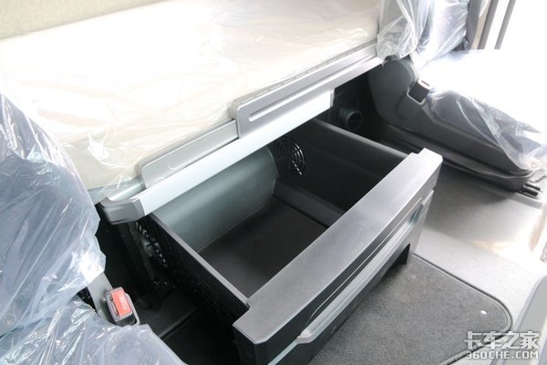 实拍车的卧铺还是非常宽的,并且床垫的舒适度也非常不错,在下卧铺下方还有一个大型储物箱,加上其他零零总总分布在驾驶室各个地方的储物柜,可以装很多东西。J7标配的220V车载电源也非常实用,可以满足大部分家用电器的需求,如果带有电磁炉的话做饭是没有一点问题。