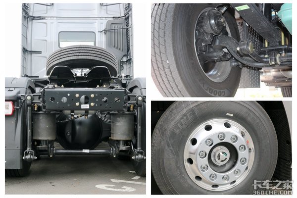 实拍车的前桥采用新F7N前轴,后桥采用465升级冲焊桥,车架高度为300×80×8mm,后桥速比2.688。这款车的轮胎选用规格为12R22.5的固特异轮胎,质量没得说。