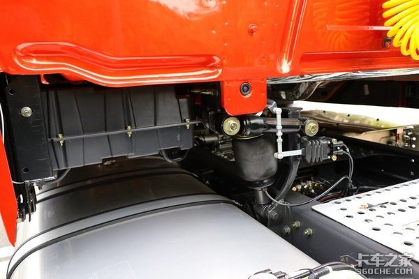 值得一提的是,乘龙T5的驾驶室并没有和车架采用硬链接方式,之间增设了四点悬浮气囊减震机构,保证驾驶室的舒适性。这样一来,驾驶室和车架之间又有一部分空间可以利用,柳汽的设计师就把气瓶塞到驾驶室下面,充分利用车辆的使用空间。