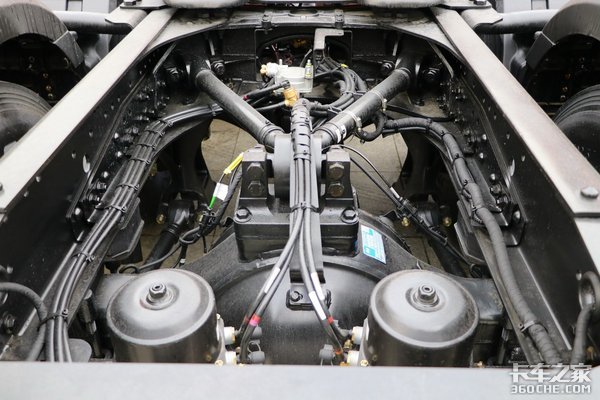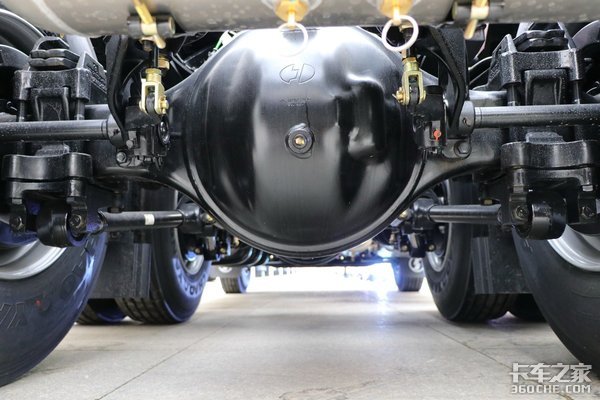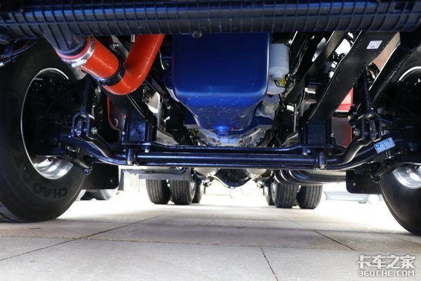 底盘方面,前桥采用汉德7.3T曼技术前桥,后桥采用汉德13T曼技术单级减速桥,后桥速比为3.7。少片簧设计,符合悬架轻量化的趋势。