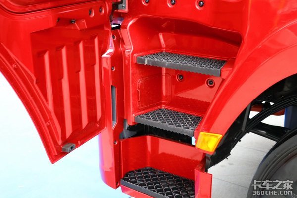 驾驶室的舒适性和细节设计的人性化肉眼可见。驾驶室设计有四级蹬车踏板,表面带锯齿,增加摩擦力,上下车更安全。中间镂空设计,能减少驾驶员将脚上的泥土带入车内的情况。