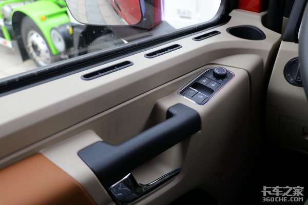 一体式后视镜设计美观,能有效降低风阻,支持电动调节和电加热,很是方便。其背面还粘贴了"SHACMAN“字样的银色装饰条,配合上补盲镜,大幅减少了驾驶员的视野盲区。