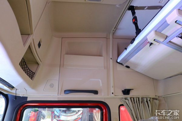 驾驶室上方的储物空间十分宽裕,方便车主存放各类物品。双卧铺的尺寸基本与德龙X3000相同,下卧铺宽达900mm。侧窗、后窗的设计保证了驾驶室内光线充足。驾驶室带360°窗帘,夜晚休息时拉上窗帘能营造更好的休息环境。