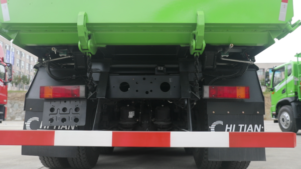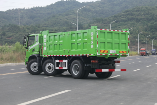 这台DV3三轴的自卸车,它的货箱宽度可选择2.2米、2.3米等不同的宽度,同时它采用了457的缩短后桥,在设有货车限宽墩的城郊和乡镇道路上,小巧的车身宽度让它具有良好的通过性能。