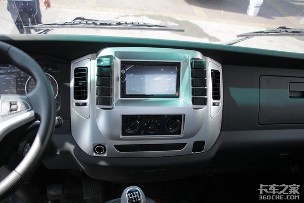 对称式中控台,银色的全身镀铬和驾驶室内饰形成了鲜明的对比。中控台上还配置了显示屏,增添行车过程中的娱乐感,在显示屏的两侧预留了很多空白按键,有需求的卡友可以选装其他设备,下面就是旋钮式的空调控制系统。