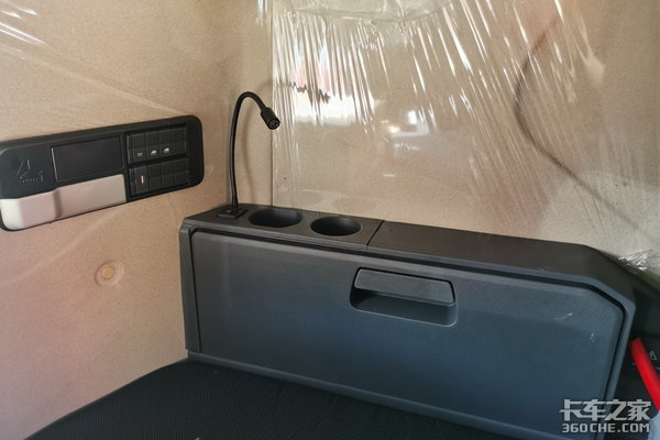在卧铺位置上还布置有阅读灯、车窗开关、USB接口以及一个小书桌,在书桌上还设计有两个水杯架,下方还带有储物格,可放置书本、单据、资料等杂物。从这些小细节上不难看出,这款豪沃TH7在更贴近卡车人的生活,充分考虑到了驾乘人员的实际所需,将舒适性和功能性进行了很好的结合。