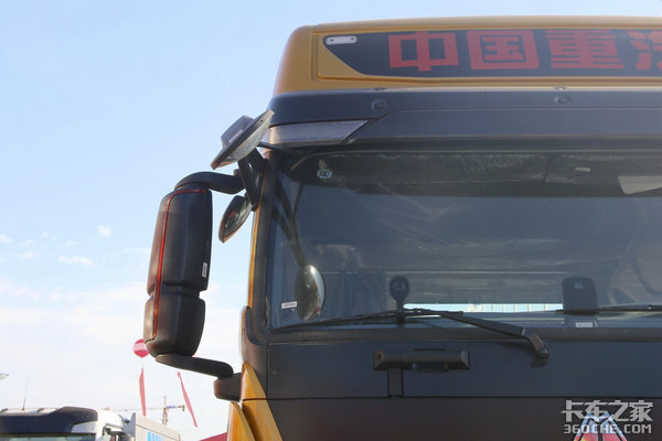 前面罩增加了一根镀铬装饰条,加大了黑色面板的使用面积,而原先位于进气格栅位置上的重汽车标也移动到了上方,取了中间“HOWO”四个字母,在左侧增加了“豪沃”汉字车标。中网两侧的导流槽造型也发生了变化,采用了类似直角三角形的设计,与整车流线的外观相辅相成。