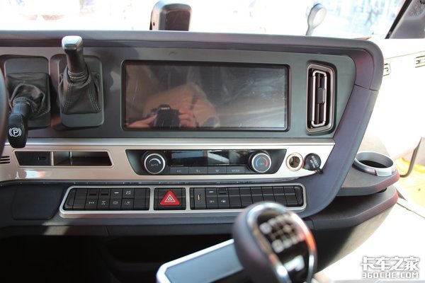 中控操作区域特别有设计感,不仅美观,实用性上也特别突出。断气刹和挂车驻车手柄布置在了中控台最左侧,这样一来驾驶员伸手即可操作。中间配备的12.3寸长方形多媒体触控屏成为了内饰的点睛之笔,满满的科技气息。下方则是自动空调系统,最下排设有差速锁(轴间和轮间)、前碰撞预警、车道偏离预警、油箱加热、副油箱切换等功能按键。