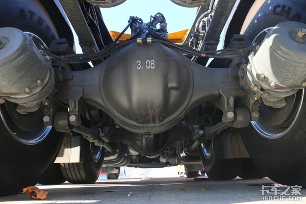 该车采用前2后3少片簧钢板悬架结构,配备MCY12BGS的12吨后桥,速比为3.08,广泛搭载于重汽车型上,重量偏向11吨级车桥,而承载力又向13吨级靠拢,在当下标准化运输的背景下,这样的配置很好的兼顾了轻量化与承载力。