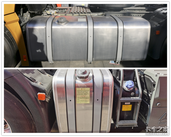 该车采用860+240L双油箱设计,总容积为1100升,采用铝合金材质,能够起到降低自重的作用。而且这种主副双油箱的布置,能够分别加注不同标号的柴油,通过在副油箱加注更低标号柴油,即使去到严寒区域,也能保障车辆顺利启动。当车辆正常行驶后,又可以切换至主油箱,以实现更好经济性。