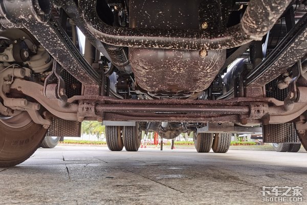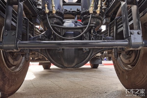 该车搭配6.5吨级前桥,以及红岩的HY485后桥配置,在悬架上使用了前2后4的少片簧设计,保证承载能力的情况下,对于整车轻量化设计有一定好处。