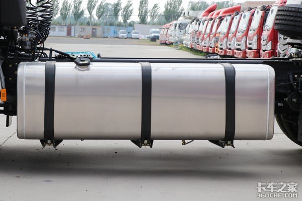 车架左侧是800L的铝合金大油箱。车架右侧还有一个100L的副油箱,可以加低标号柴油,方便北方冬季启动车辆使用。油箱总容积达到900L,按照快递牵引车一般25L/100km的油耗推测,加满油能保障3600公里的续航里程,基本相当于从北京到成都跑一个来回。