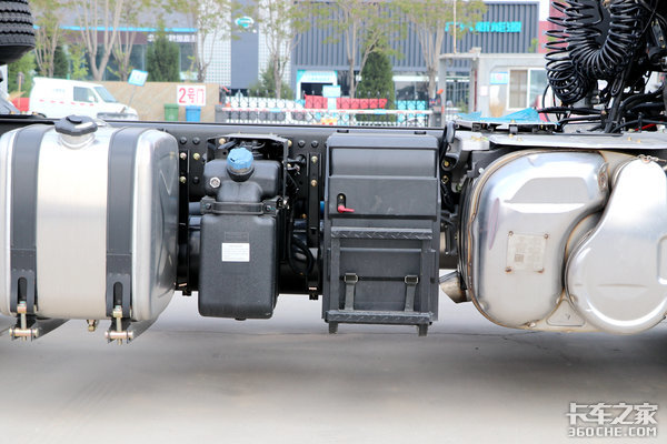 尿素箱与副油箱并排安装在车架右侧。因为是国六排放,后处理技术更加复杂,处理工序也更多。这里温馨提示下大家,国六后处理价格昂贵,添加尿素时请选用正规车用尿素溶液。