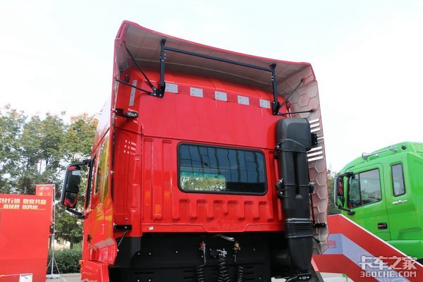 车顶配备的导流罩面积较为宽大,并且它拥有260mm的可调整角度,能够适配市面上大部分的挂车。为整车带来降低风阻系数和提高燃油经济性的优势。