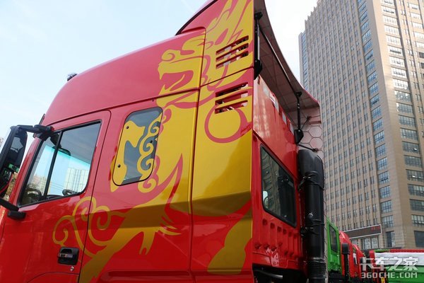 驾驶室侧面设计上,用麒麟图案装饰将驾驶室和导流罩连接起来,形成视觉上的一体化,显得十分有气势。红色背景配上金色图案,就更为凸显高贵和大气的质感。