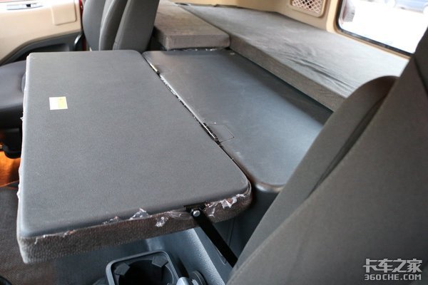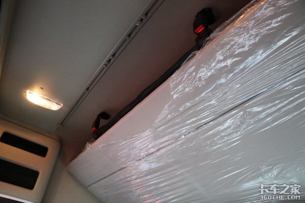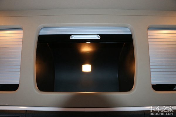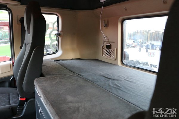 驾驶室休息区配置也非常到位。超宽的床垫容纳下一名体型魁梧的男性完全无压力,并在两侧设置了可换气的车窗,杯架、挂钩、USB充电接口,也设计了网兜来放手机等物品,实用性方面做得不错。