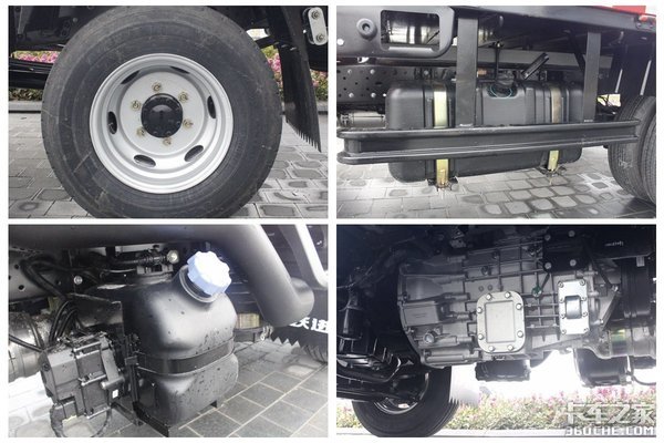 这款车的轮胎选择的是万力轮胎的真空胎,轮胎规格为7.00R16LT。油箱采用符合材料,质量更轻,容量为100L。这款车的发动机以及变速箱都是采用铝合金的壳体,油箱以及尿素箱则是采用质量更轻的复合材料,在细节上充分降重