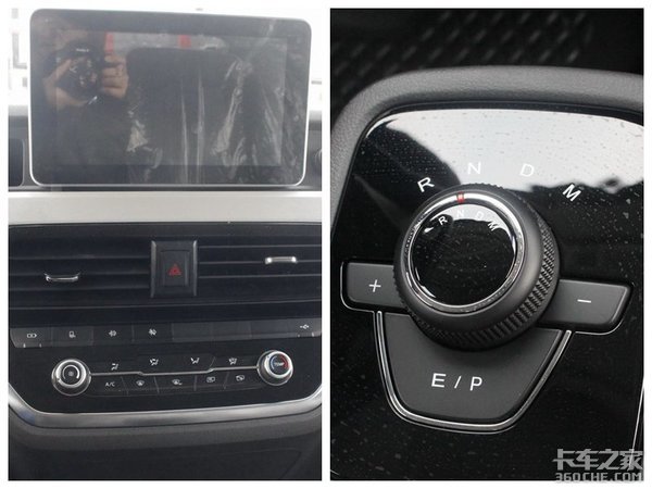 这款车的中控台在轻卡中也算是配置比较高的,最上方是多媒体大屏,中间是空调出风口,下方则是各种功能性配置的开关按钮以及手动空调旋钮。这款车还可选配车联网系统,满足卡友差异化需求。这款车的挂挡系统也是旋钮模式,习惯了挡杆操作的卡友可能要花时间去习惯,旋钮上有“R”“N”“D”“M”四个选项。