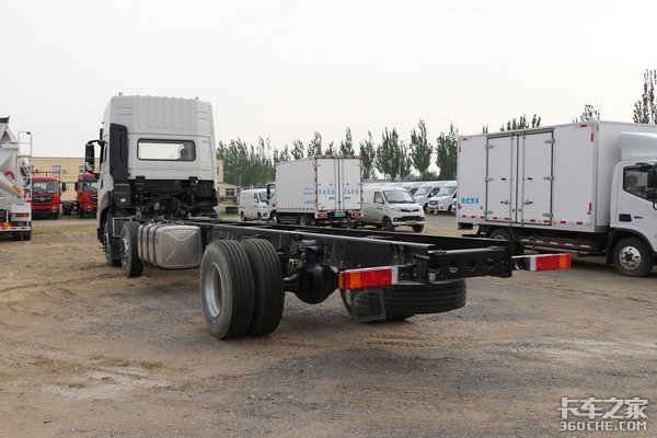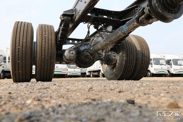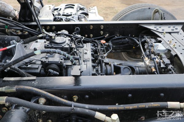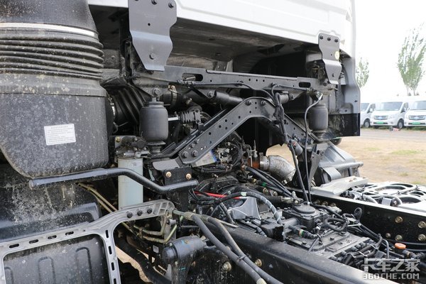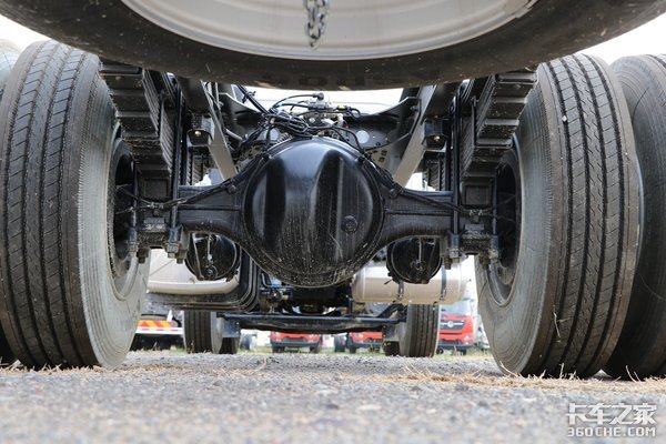 该车采用10吨级后桥,速比3.909。从底盘来看,由于车架较长,大多数部件线路都能很好地布局,整体简洁清爽。
