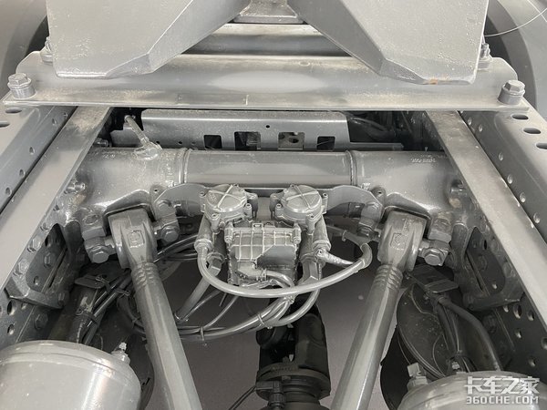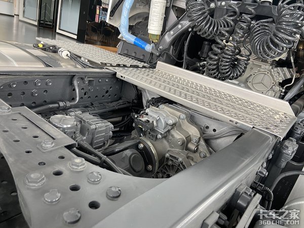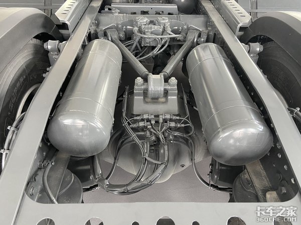 底盘的其他方面就是一些小细节的优化,包括管线走向,以及各种管线之间的包扎等等。另外新Actros还优化了车架管状梁,把管状梁设计成了一个储气罐,既可以起到连解强化车架的作用,还可以作为储气罐使用,一举两得。