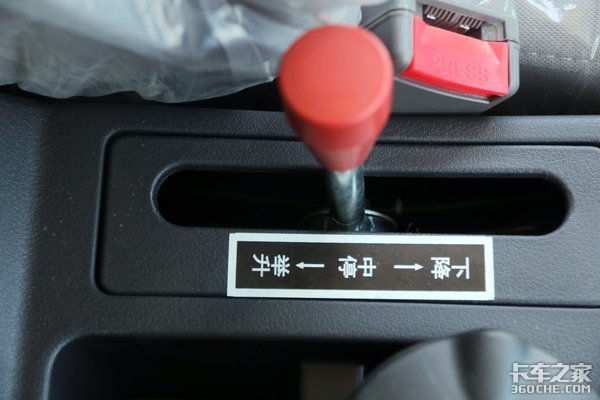 手控阀(控制货箱举升)布置在安全带卡扣旁边,为红色手柄设计,并且对手控阀工作状态有一个比较简单的解释。以驾驶员一侧为准,向前是下降,向后是举升,中间则表示中停,也就是货箱会保持现有的状态不变。