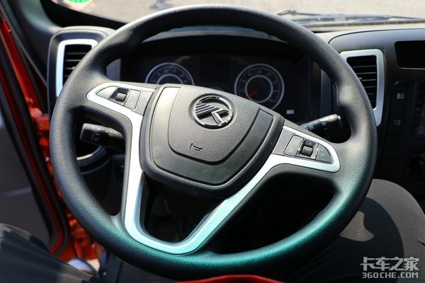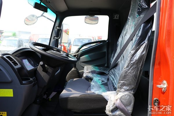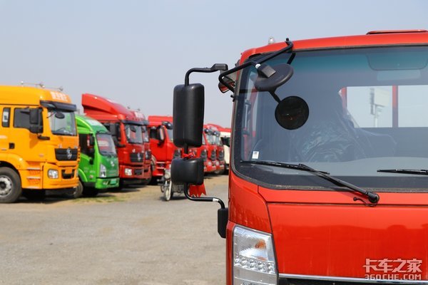 这款车采用直立A柱的设计,前脸看起来方方正正的,非常敦实,整车采用中国红的涂装,比较经典。这款车的造型设计非常简约,非常耐看,这款车的包角还是非常圆润的,这样在高速行驶时,可以更好地降低风阻。这款车选用中体驾驶室,驾驶室宽1900mm,这样在方便这款车走街串巷的同时,驾驶起来也不会感觉拥挤,非常用心。