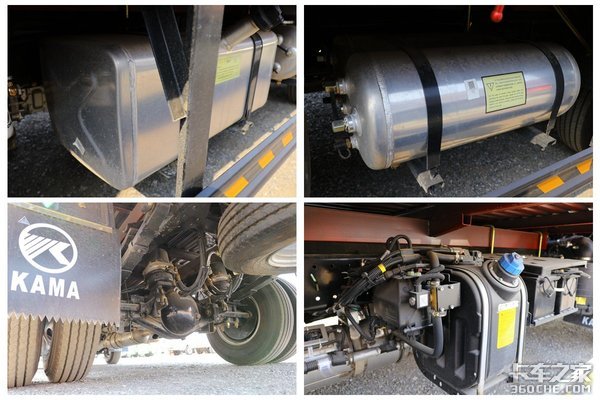 这款车采用1064AQSM前桥以及同款后桥,后桥速比4.333。采用前7后9+5的钢板弹簧悬架,在保证车辆承载力的同时,也能满足轻量化的需求。这款车的油箱、储气罐也是采用了铝合金的材质,轮胎选用华鲁轮胎,轮胎规格为7.00R16LT,整车在轻量化方面下了不少功夫,整车重量控制在了2.56吨。