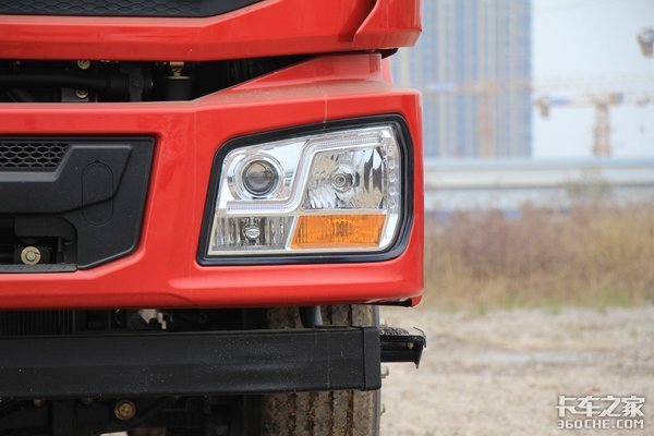 组合式大灯布置在一体式保险杠上,集成设计了远近光灯、雾灯、转向灯以及LED日行灯,保险杠中部还带有蹬车踏板,搭配挡风玻璃下方的简易扶手,方便卡友日常擦洗挡风玻璃。