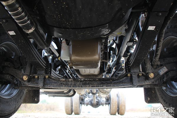 油箱为300L铝合金油箱,除了油箱以外,变速箱壳体、储气筒等都采用的是铝合金设计,以降低车身自重,另外车架两侧还预留了很大的空间,可以后期加装其它设备,比如水箱、工具箱等。