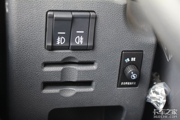 虽说现在ETC得到了很好的推广,但是由于货车需要称重,尤其是绿通运输需要审核查验,大多数情况还是走普通人工通道,因此在方向盘的左下方,还设计了两个卡槽,可以将高速卡、油卡等随手放置好,拿取也比较方便,多功率省油开关也位于这部分。
