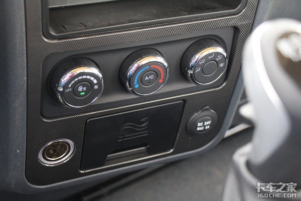 这款陕汽德龙L3000的驾驶室内标配电动冷暖空调,无论是冬天还是夏天开车可以更舒服一些,另外下方还带有24V点烟口,但是需要加装转换接口才可以给手机充电,稍微有些不方便。