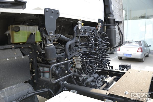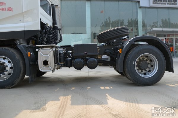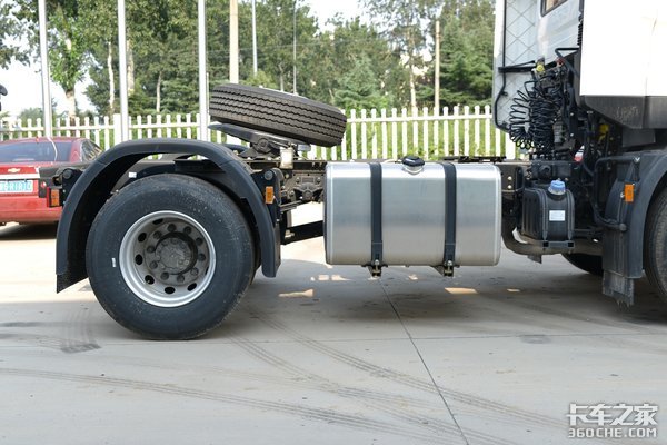 车架右侧则集成了尿素溶液罐以及铝合金材质的油箱,轻量化的设计也在一定程度上降低了车身自重。从油箱400L的容积来看,也还是主要适合短途快运或者港口拖运等运输需求。