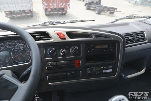 中控区域功能丰富,平行四边形样式的危险警报灯旁设计有两个小储物格。下方是手动空调控制区域,空调下方是定速巡航、DPF再生禁止开关等按键。右侧是简易的多媒体系统,带有AUX接口和USB接口等,多媒体下方预留有储物格。