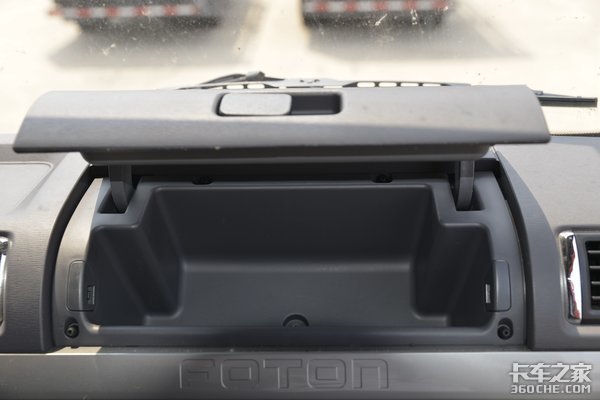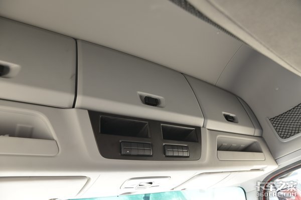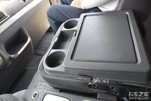 这款欧航R系采用高顶双卧驾驶室,车内驾乘空间和活动空间比较宽敞。并排设计有3个座椅,中间的小座椅翻折下来可以充当一个小桌板,很是实用。