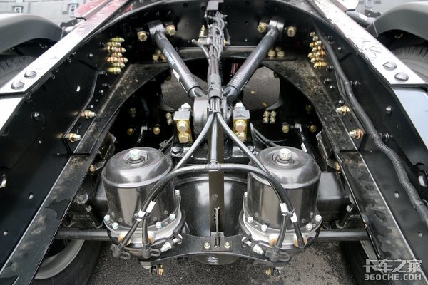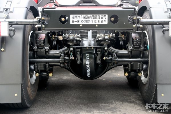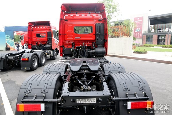 车桥及悬架方面,后桥采用11.5T的汉德425单减桥,支持10万公里长换油,保证了车辆更高的出勤率和更低的维护成本,后桥速比为3.7。整车采用前3后4的少片簧设计,有利于整车轻量化。